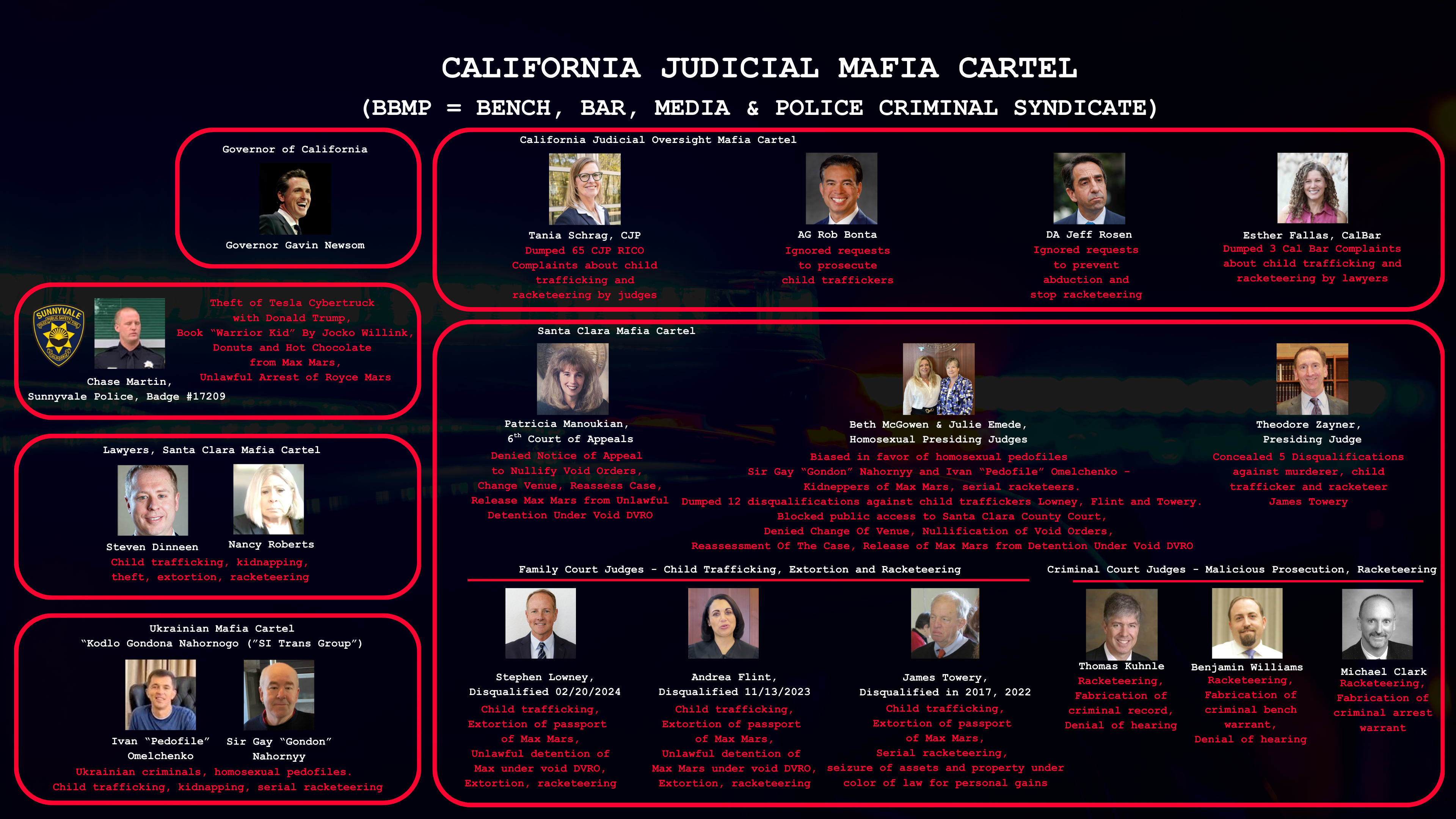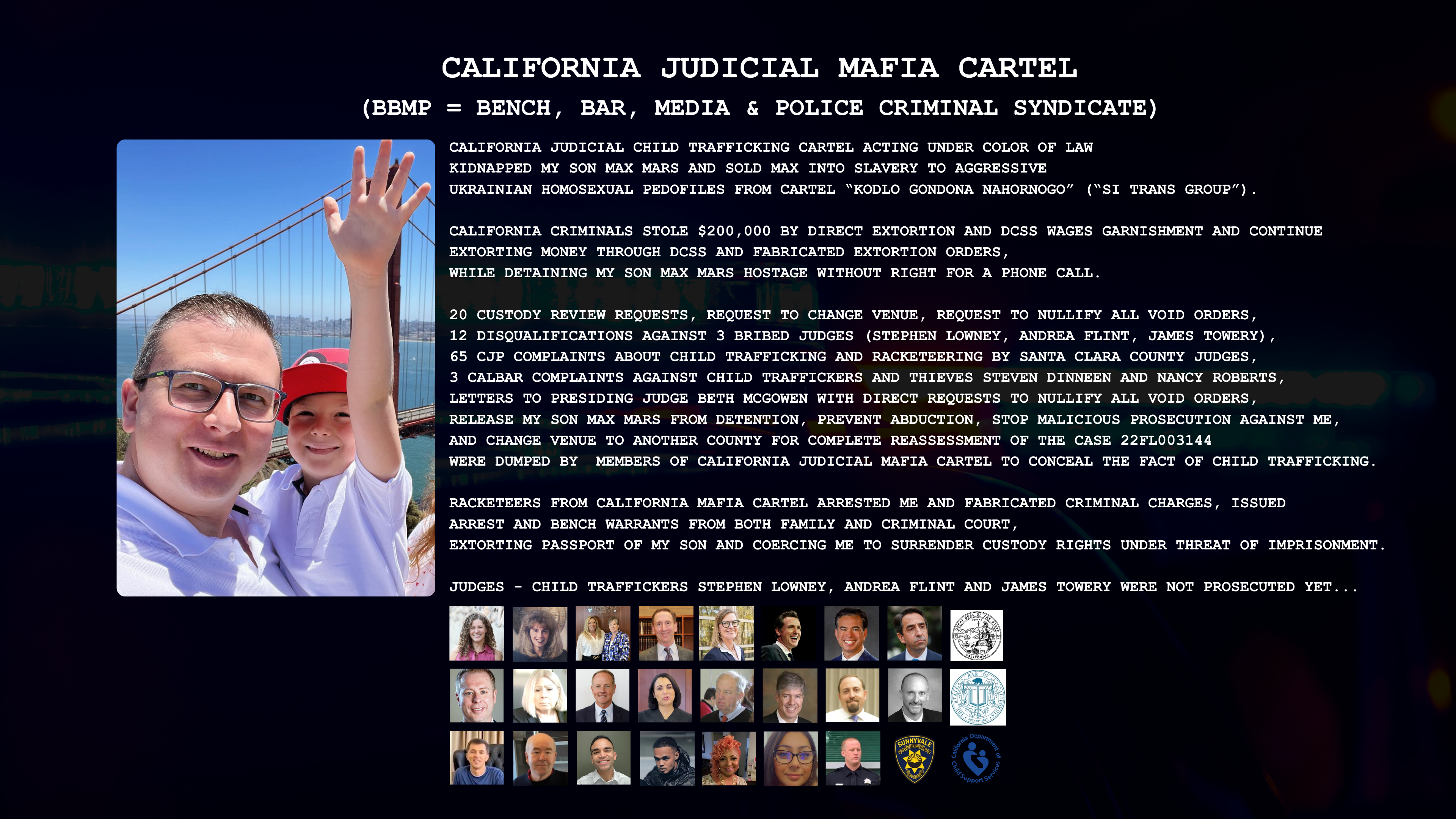 I discovered this massive criminal syndicate due to kidnapping of my son Max Mars - who is detained hostage without right for a phone call since kidnapping by criminals from California Judicial Mafia Cartel in September 2022.